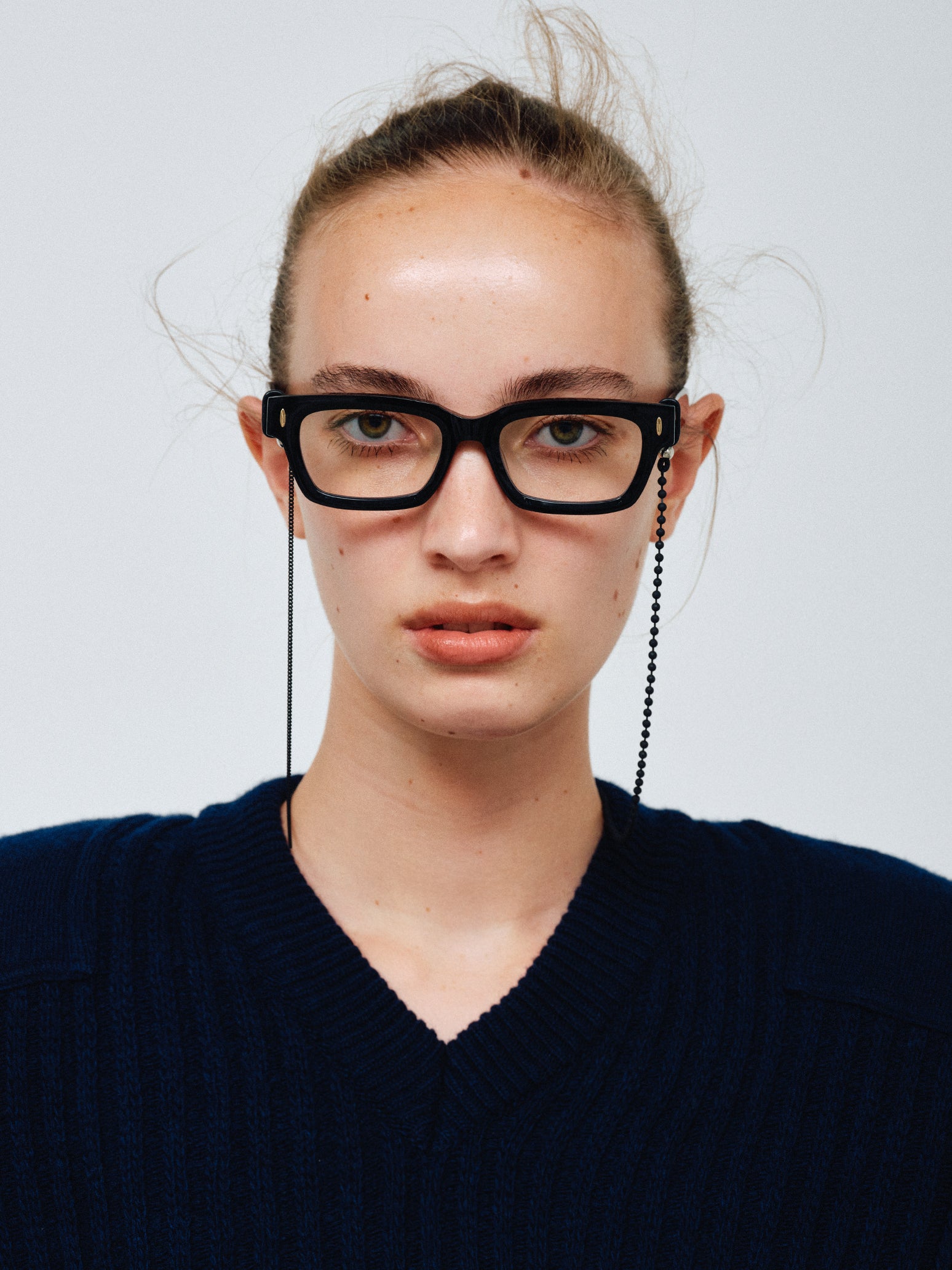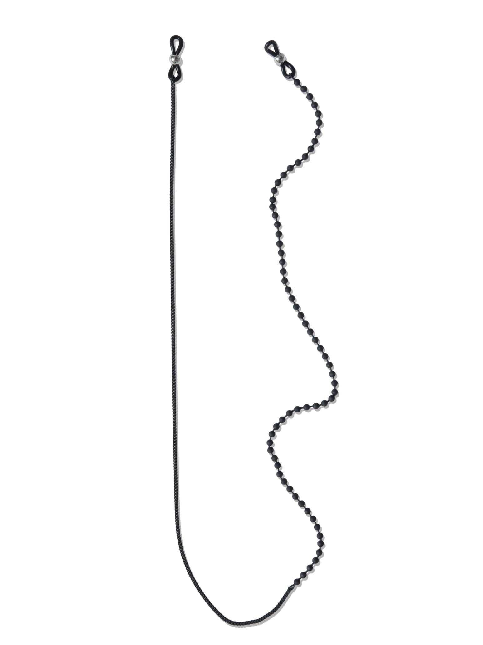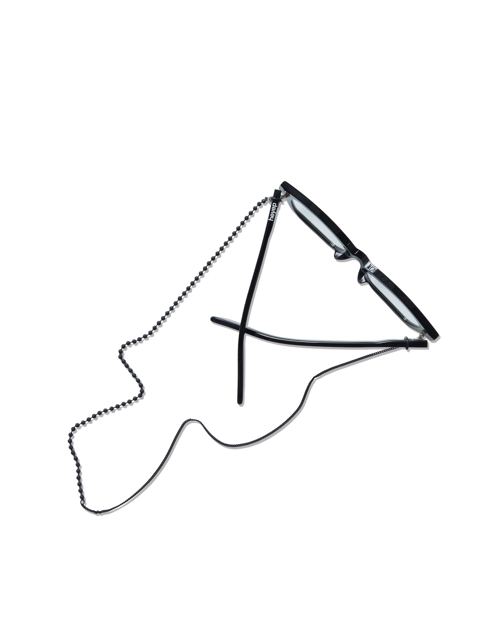 異なるサイズのボールチェーンを左右で組み合わせた、非対称デザインのアイウェアチェーン。