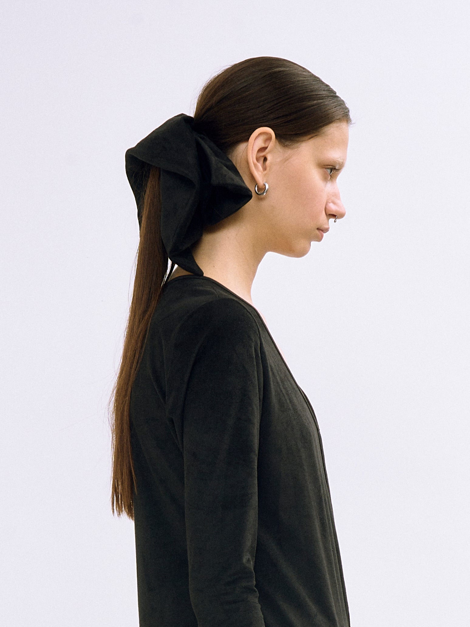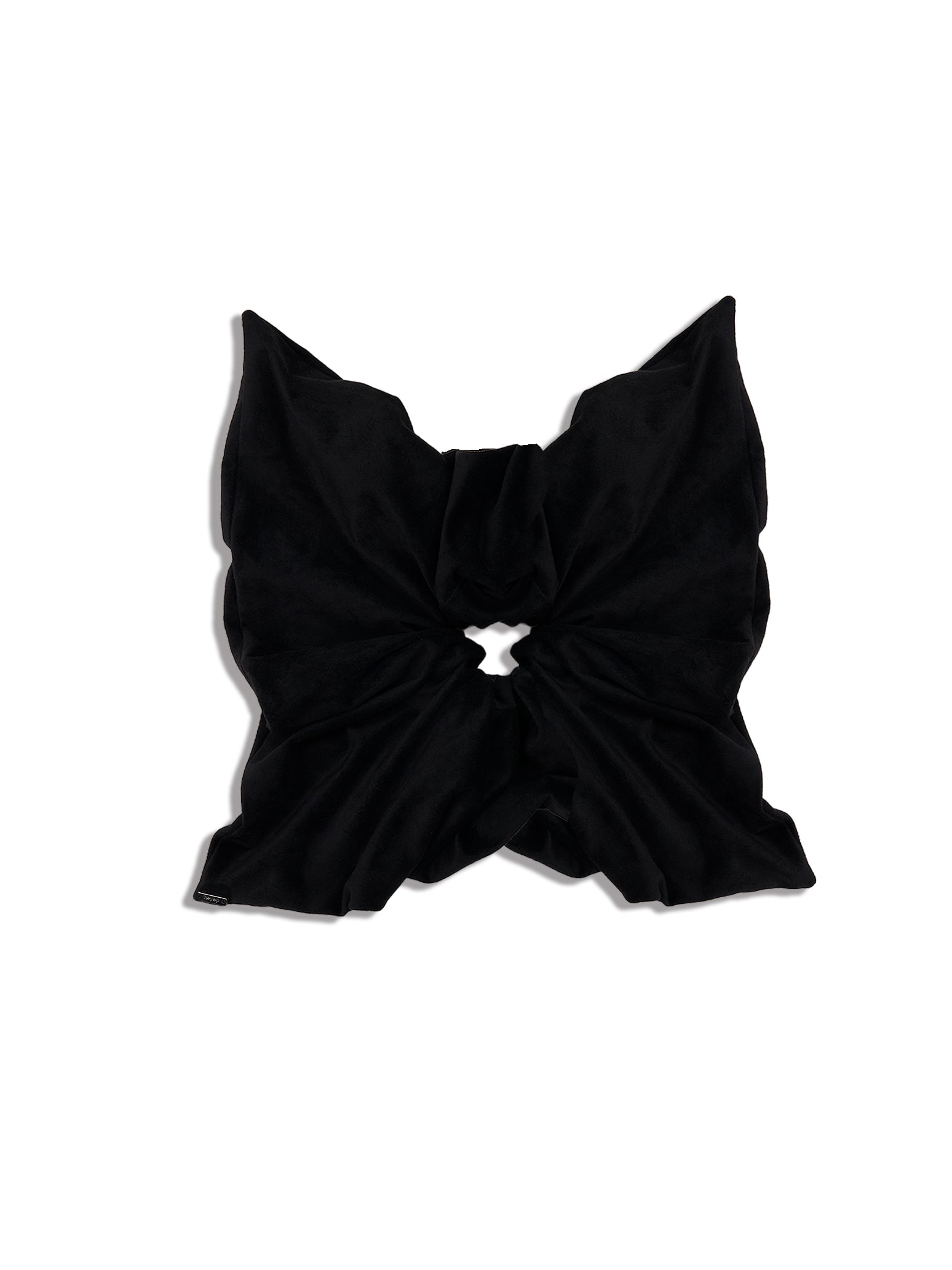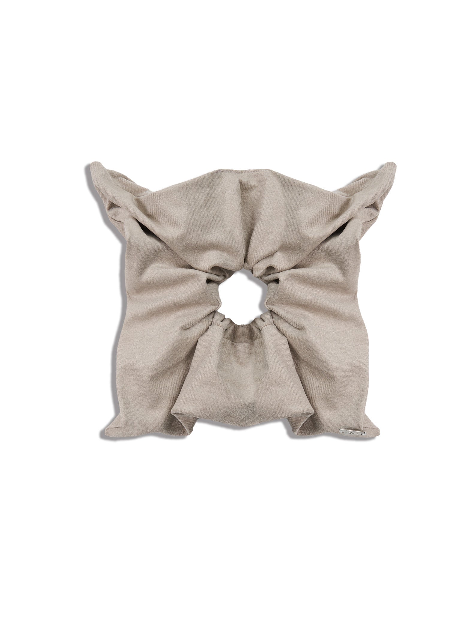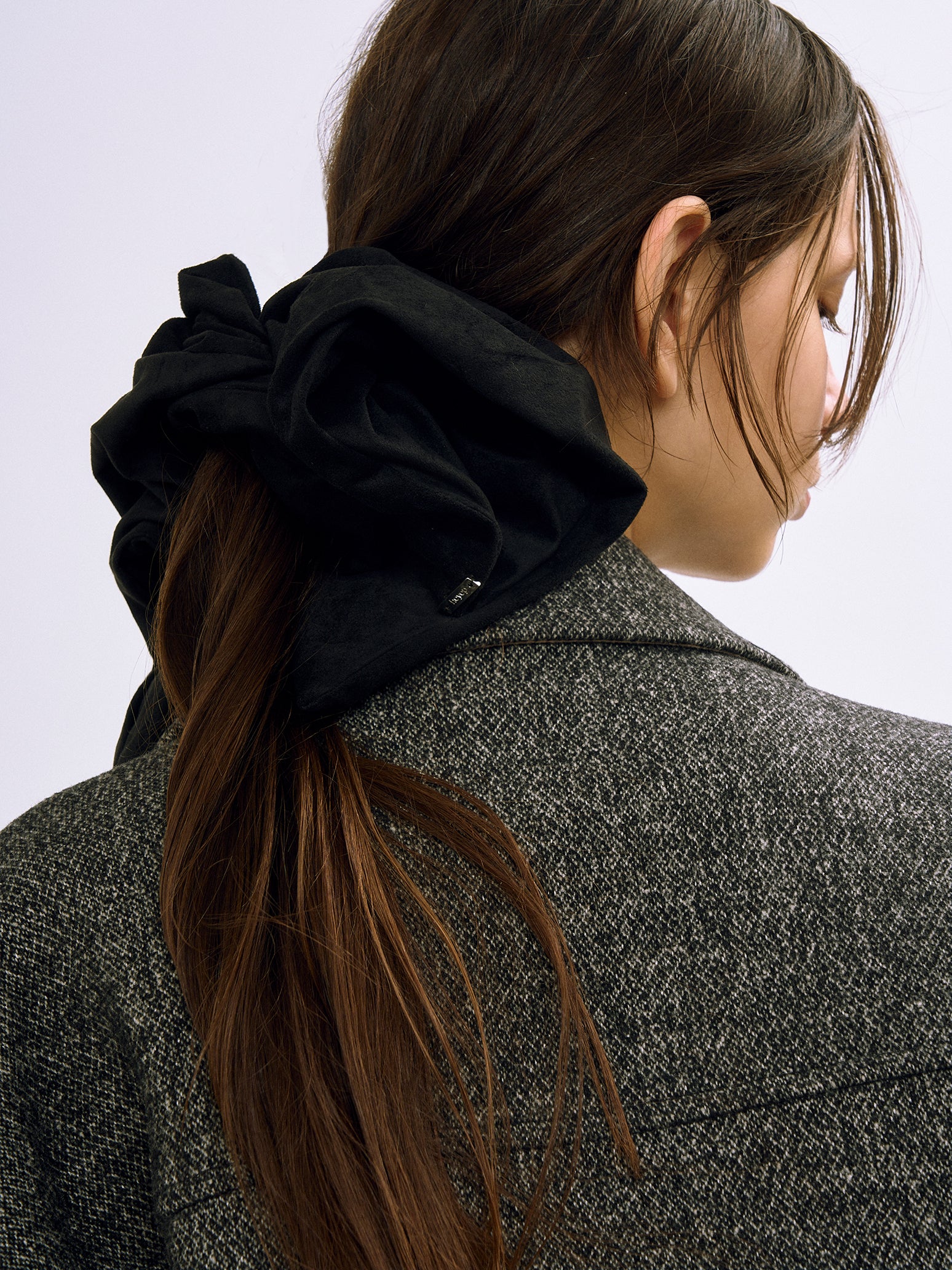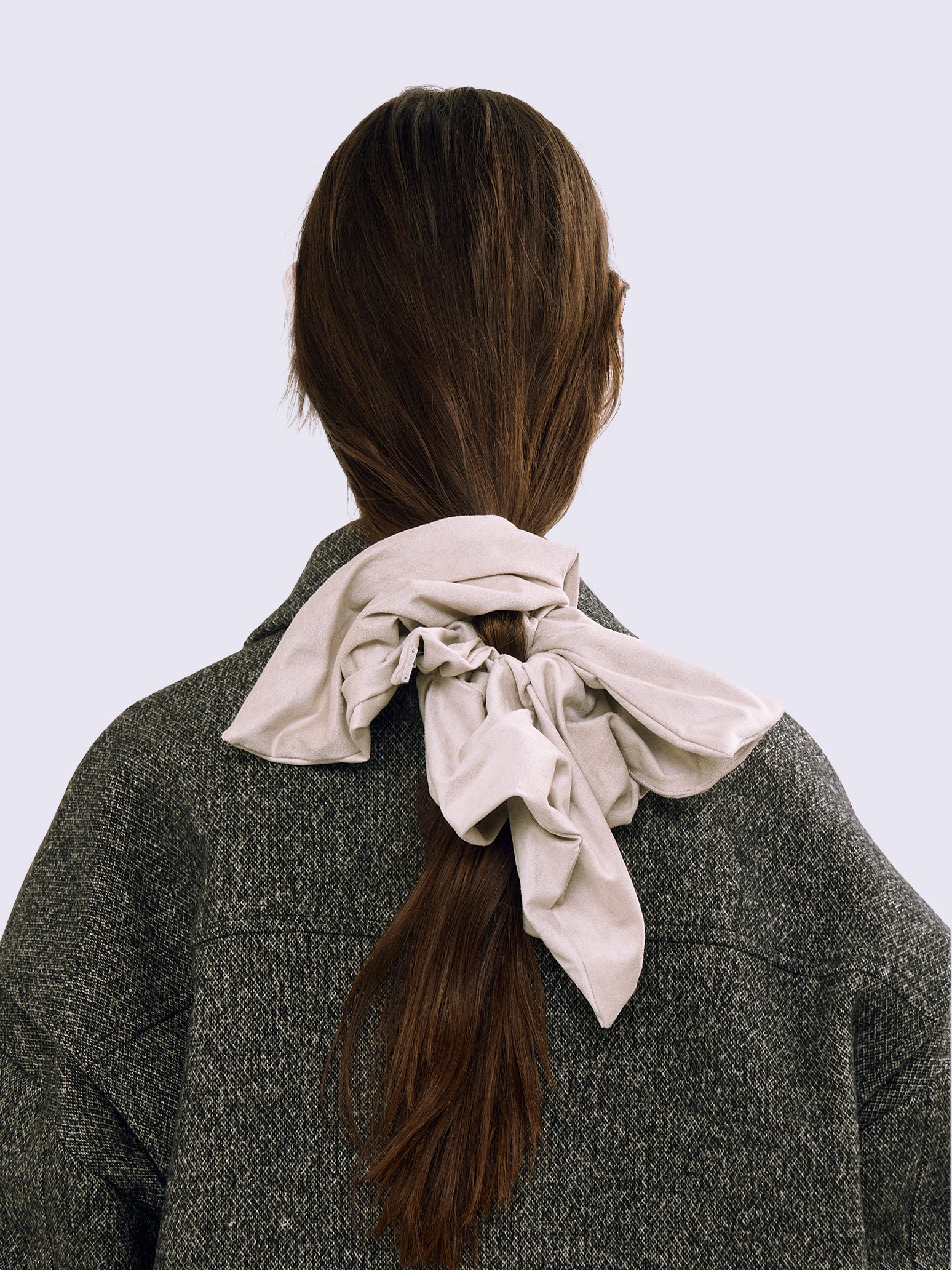 上品なスエード風の質感で、クラシカルな雰囲気を纏ったスクエアラージシュシュ。存在感のある大きめのスクエアデザインが、よりモードな印象を演出し、前から見たときにもスクエアのエッジがスタイリッシュな印象を与えます。デイリーから特別なシーンまで幅広く活躍するアイテムです。