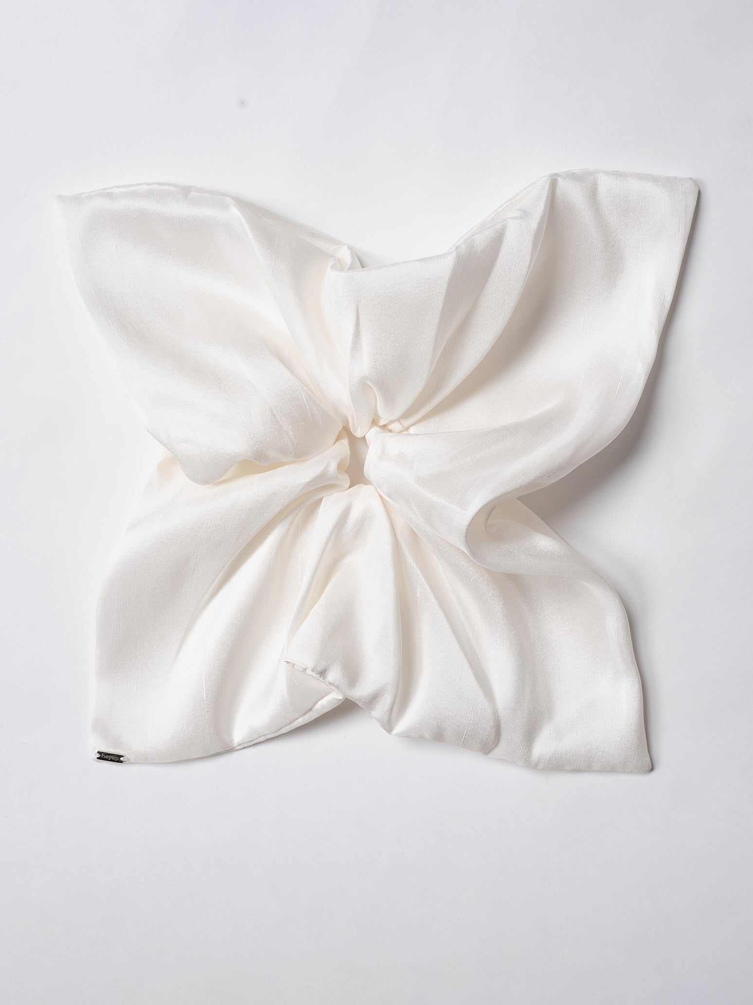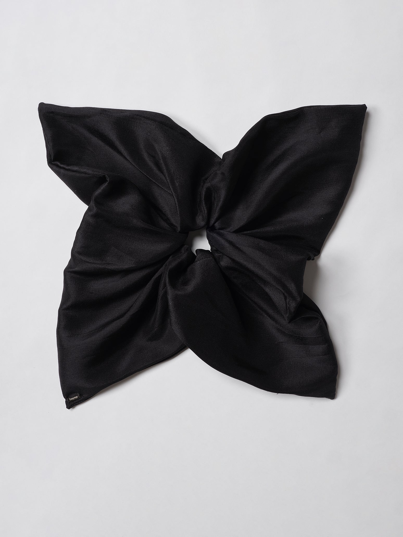 ラージサイズのスクエアシュシュは、スクエアの生地が折り重なって、リボンのような印象的なバックスタイルに。