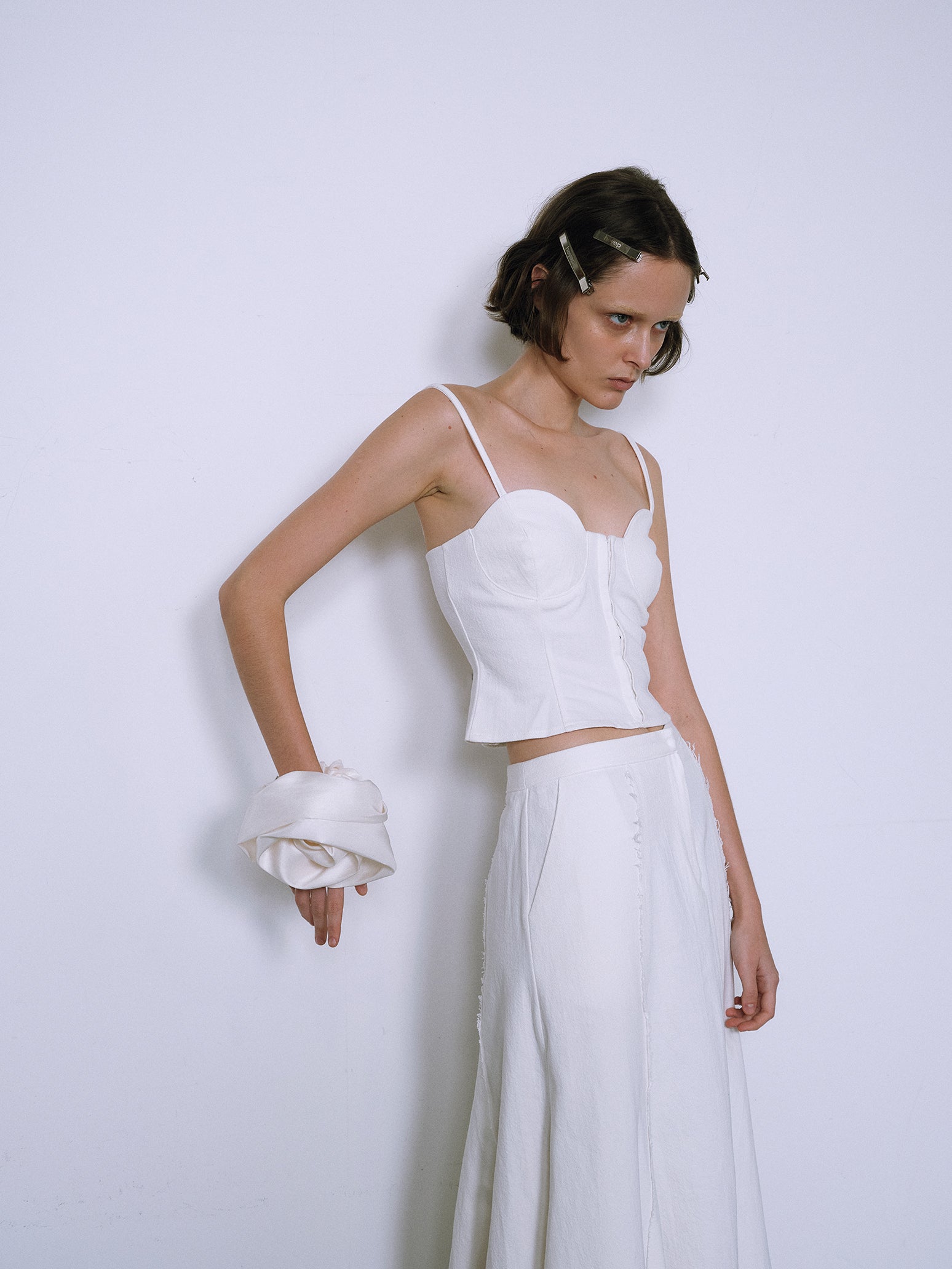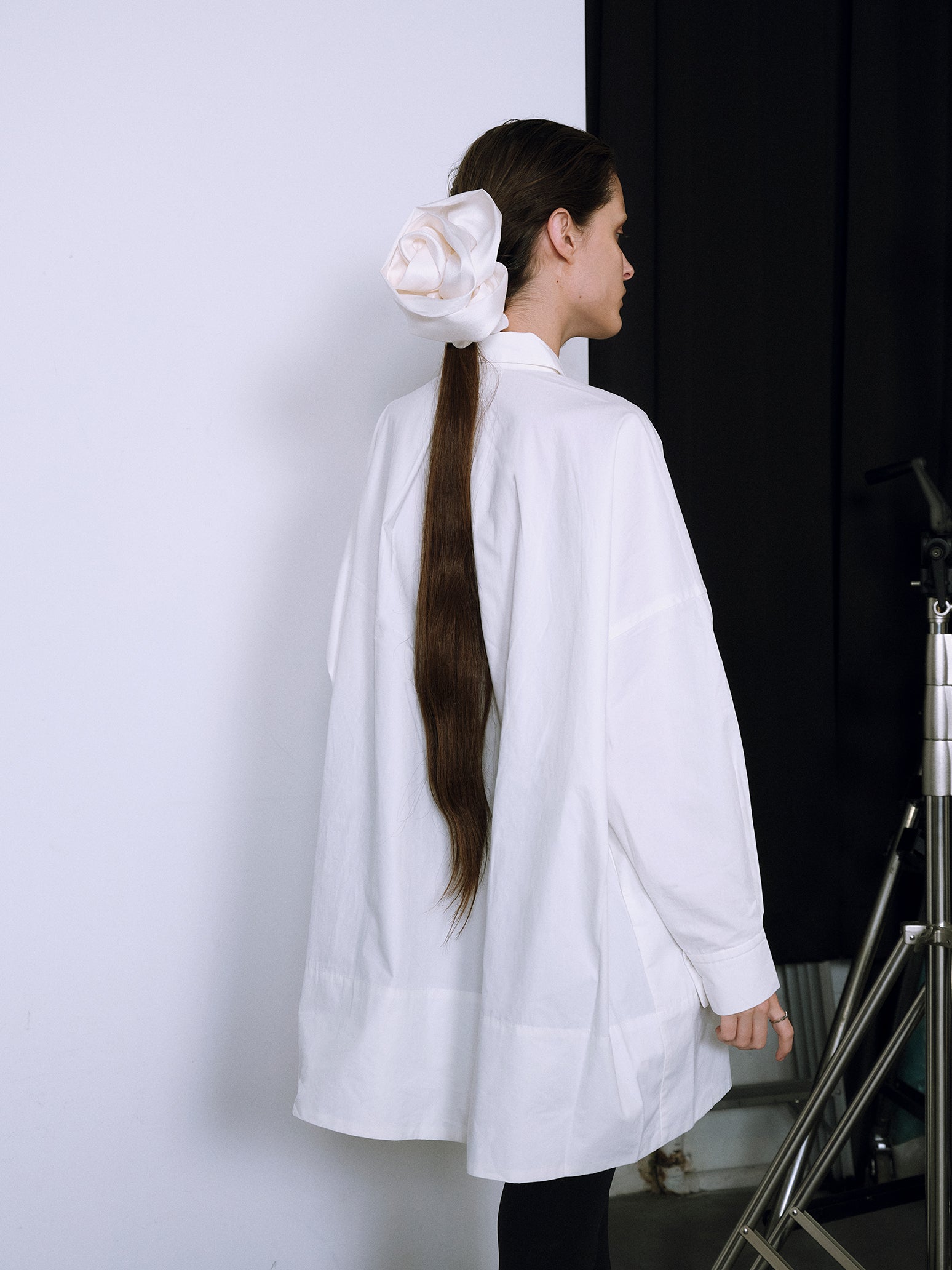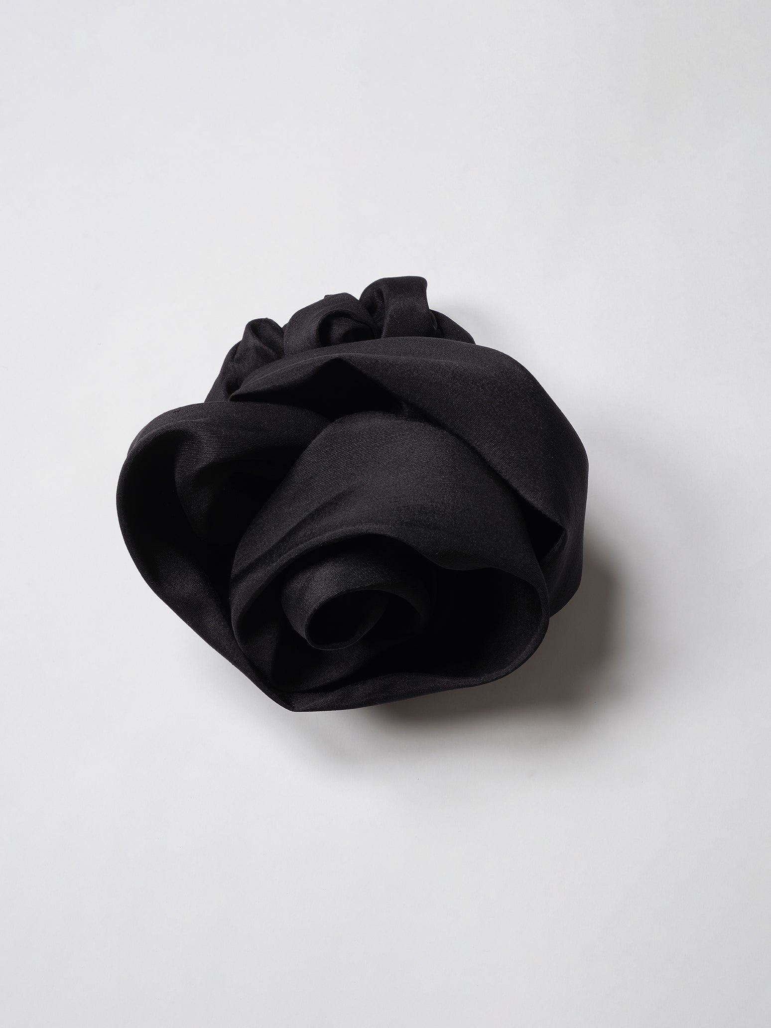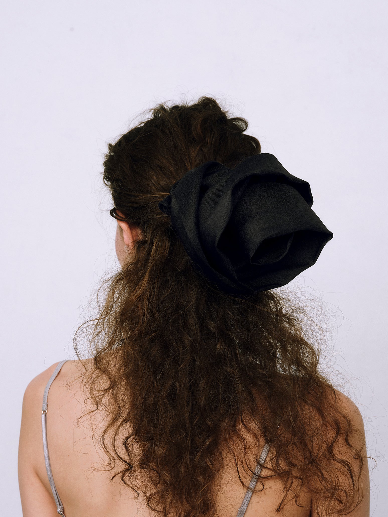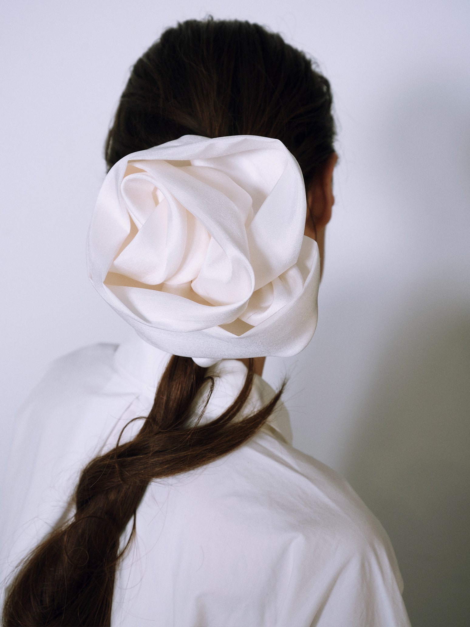 花びらが折り重なるように仕上げた立体的なローズデザインは、シルクの自然で柔らかな光沢で、大きめのデザインながらもエレガントなバックスタイルに。